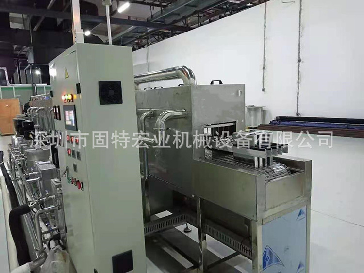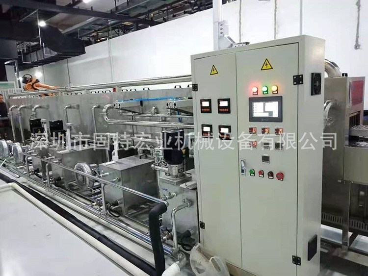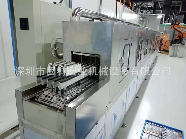 新能源鋰電池鋁殼超聲波清洗機(jī)作業(yè)流程:裝有產(chǎn)品的洗籃放置自動(dòng)入料臺(tái)上,由PLC 控制進(jìn)料系統(tǒng)定位再通過(guò)提升機(jī)構(gòu)、平移機(jī)構(gòu)的配合龍門機(jī)械手依次送入各工序段,對(duì)工件進(jìn)行各工序段的清洗、漂洗、脫水、干燥完成后,通過(guò)傳動(dòng),自動(dòng)將洗籃送出,人工卸下洗籃,即完成整個(gè)清洗過(guò)程。整機(jī)清洗部分為全封閉結(jié)構(gòu),裝有可拆卸的觀察檢修門。設(shè)備配電設(shè)施為獨(dú)立的電控柜放置進(jìn)料口位置。經(jīng)多年的設(shè)計(jì)制造經(jīng)驗(yàn)證明,結(jié)構(gòu)合理,并配有超純水設(shè)備作為清洗水源是理想高潔凈度清洗專用設(shè)備。